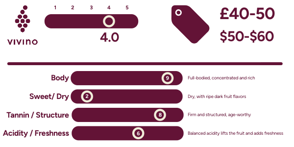 On the taste scale, this is full-bodied, elegant, and complex, with well-integrated tannins and a long, lingering finish. Price-wise, expect around £40–50 / $50–60, reflecting its quality and cellar-worthiness. On Vivino, it generally sits at 4.3–4.4/5, highlighting its acclaim among enthusiasts of premium Barossa Shiraz. Pair it with rich lamb dishes, slow-cooked beef, or aged cheeses to fully enjoy its depth and complexity.